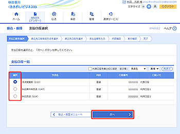 振込先を選択し、[次へ]ボタンをクリックしてください。