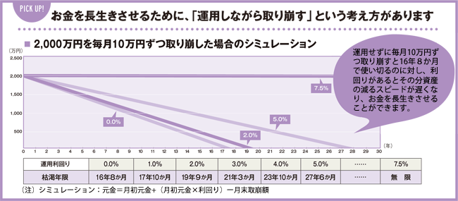 今ある資産を使う時期で分けてみると、70代以降で使うお金は今から10年以上は使わないお金ということが分かります。70代以降もゆとりある生活ができるように、使う時期に合わせて運用する金融商品を選びましょう。