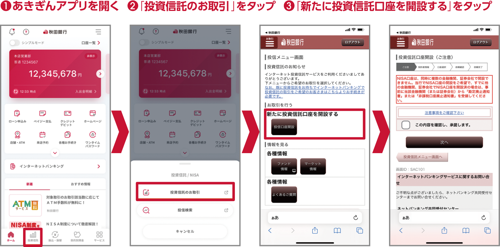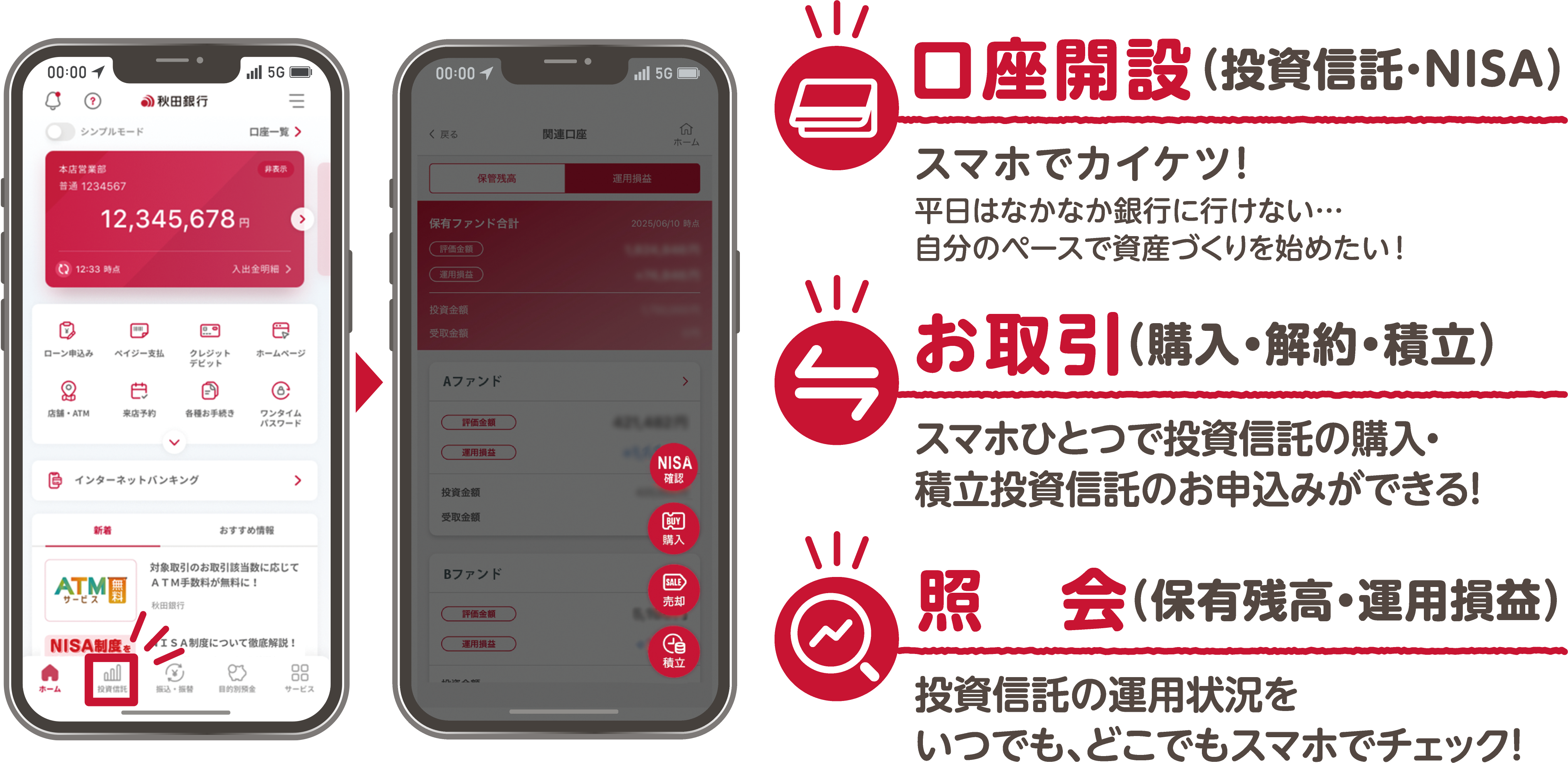 【投資信託の留意事項】 投資信託は預金ではなく、預金保険および投資者保護基金の対象ではありません。投資信託は、銘柄ごとに設定された申込手数料(最高2.20%、消費税込み)、信託報酬(最高2.420%、消費税込み)および信託財産留保額(最高0.3%)等の諸費用がかかります。また、投資信託は価格の変動等による損失が生じるおそれがあります。商品ごとに費用等およびリスクは異なりますので、最新の投資信託説明書(交付目論見書)等をお読みください。 株式会社秋田銀行 登録金融機関 東北財務局長(登金)第2号 加入協会:日本証券業協会